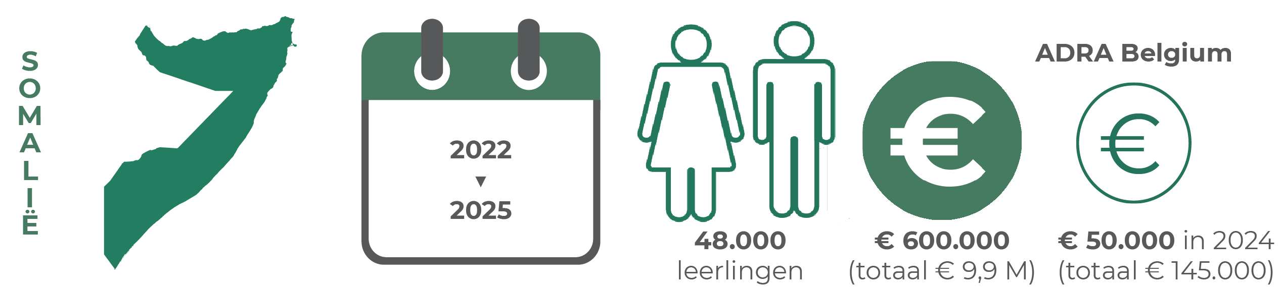In Somalië kunnen maar heel weinig mensen lezen en schrijven. Volgens UNICEF ging in 2020 minder dan een derde van de kinderen naar school. Gewapende conflicten hebben het land in armoede gestort, scholen verwoest en het aantal gekwalificeerde leraren verminderd. Vooral meisjes, die vaak op jonge leeftijd worden uitgehuwelijkt, hebben het zwaar te verduren. Samen met het Somalische Ministerie van Onderwijs en de Europese Unie werkt ADRA al meer dan 25 jaar aan het verbeteren van de toegang tot veilig en kwalitatief onderwijs. Er zijn meer dan 50 openbare scholen gebouwd of gerenoveerd, leraren worden opgeleid en essentiële materialen worden geleverd. Dit lange-termijnproject heeft als doel onderwijs voor iedereen op een effectieve en rechtvaardige manier toegankelijk te maken en er tegelijkertijd voor te zorgen dat scholen weer veilige plekken worden.
